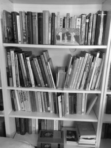 Hoe ben ik aan het werk gegaan? Dat is simpel. Er zijn twee lijsten, de ene bevat alle non-fictie bronnen, de andere de fictie. Daarbij ben ik zeer onwetenschappelijk te werk gegaan, want ik ging uit van het sneeuwbalprincipe. Ik begon met lezen, boeken die ik zomaar vond of die me aangereikt werden door vriendinnen die op de hoogte zijn van mijn, tja, eigenaardigheid? Die boeken brachten me op het spoor van meer, bijvoorbeeld via een literatuurlijst of genoemde auteurs. Ik zocht, vond vaak en las als dat boeiend leek en gaandeweg groeide de stapel. Boeken kleefden als plaksneeuw aan andere boeken, stapels groeiden, het plezier ook en er was op een gegeven moment een extra kast nodig. En nog een. Wel eens iemand gelukkig gezien? Ik ben niet vaak in mijn leven zo heerlijk bezig geweest, zonder de dwang van een methode, werk dat af moest, wat dan ook. Gewoon als een vlinder van het een naar het ander, opnemen wat bruikbaar of mooi is, loslaten wat geen zin heeft. Dat is pas studeren! De inhoud kan centraal staan en het protocol mag in de la. Ik begrijp dat niet iedereen de luxe heeft van ziek worden en daarmee arbeidsongeschikt, maar dat die situatie veel moois oplevert moge duidelijk zijn.
